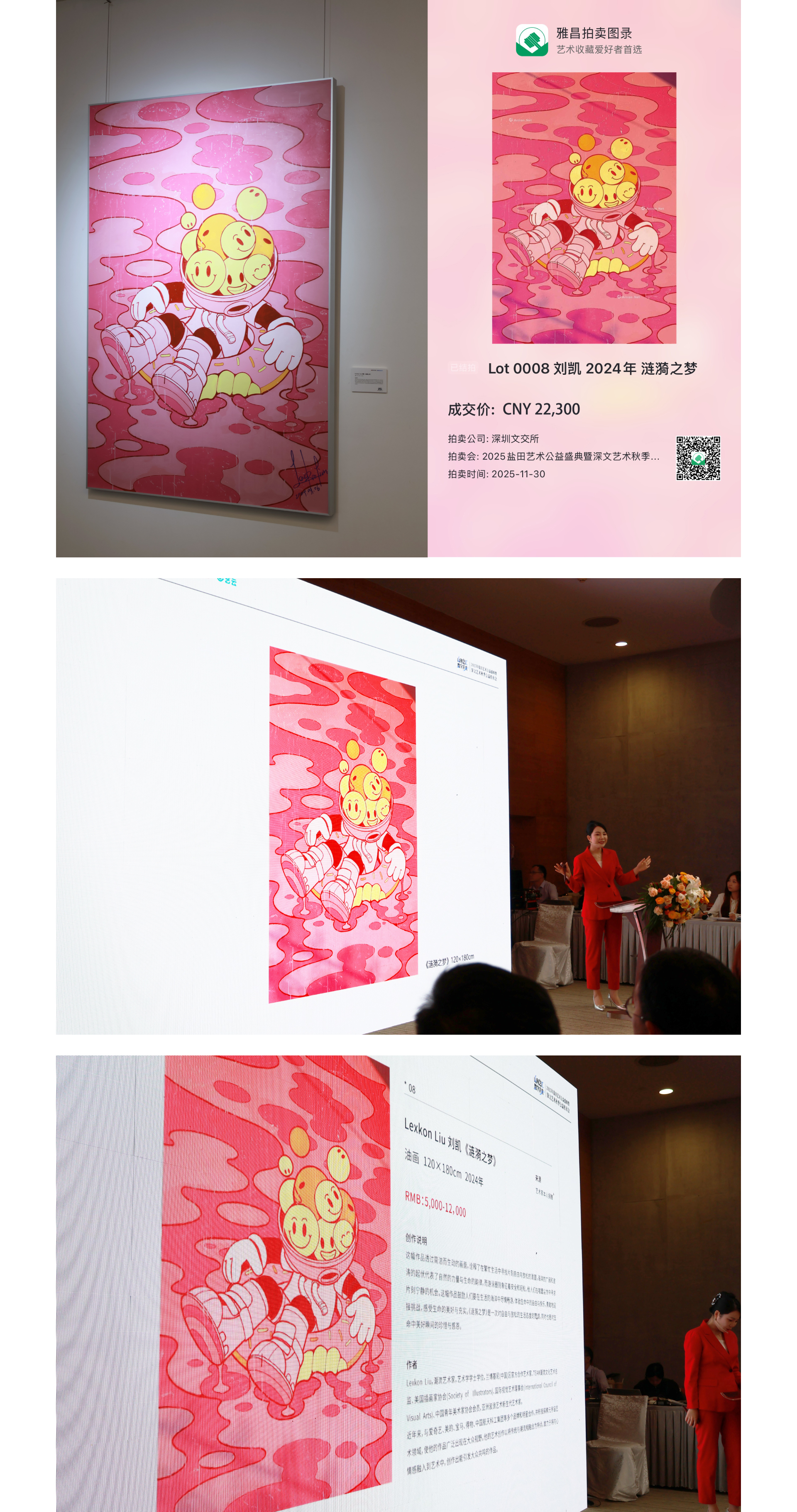 2025年11月30日,潮流艺术家 Lexkon Liu 的作品《涟漪之梦》在“2025盐田艺术公益盛典暨深文艺术公益秋拍”中以 2.23 万人民币成交。